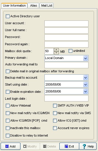 Define the domain for user account. The default value is Local Domain, which means the domains you host in this server will be all belong to this user to be his email addresses. If you choose a domain for the account, it means the user ONLY can use this domain to be his email address.
