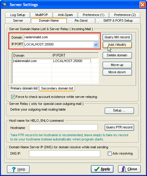 Click [Relay] tab. Add your domain here and relay to localhost 25000 port.