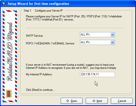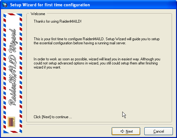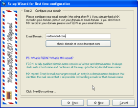 Choose a directory path to install. After installation, a setup wizard will popup to guide you through first time setup. This sample will take raidenmaild.com as sample domain.