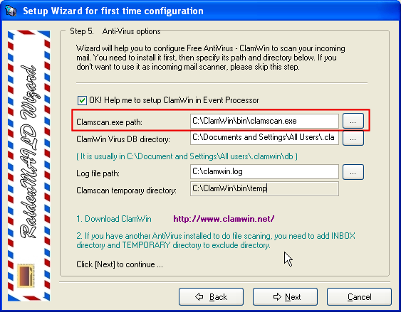 - Add RaidenMAILD Inboxes directory and ClamWin temporary directory to exclusive directory.